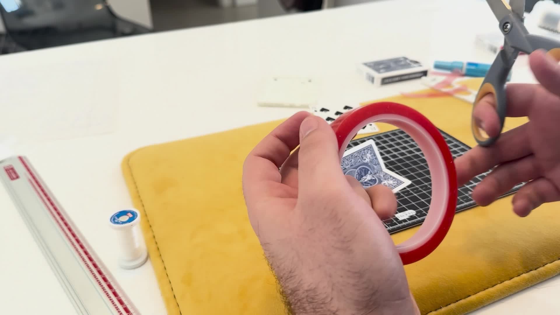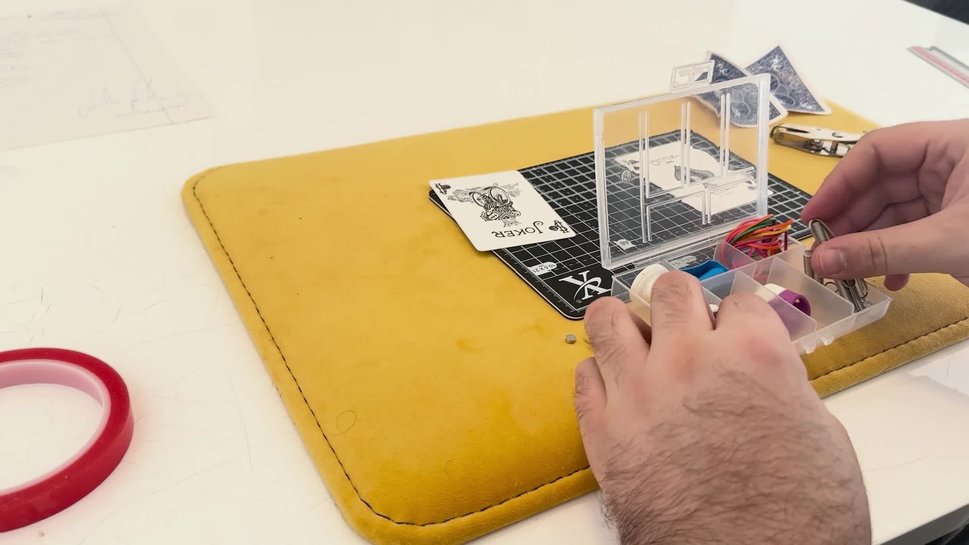 You'll start by learning the most important skill in gimmick making: card splitting. Julio shows you how to peel a card into thin layers without ruining it. Once you can do that, you can hide magnets or elastic thread inside the card. When you glue it back together, it looks like a single, thin card, but it has a "secret" built inside. You'll also learn how to make custom "gaff" cards, like a card that is half-red and half-blue, by layering different pieces together.