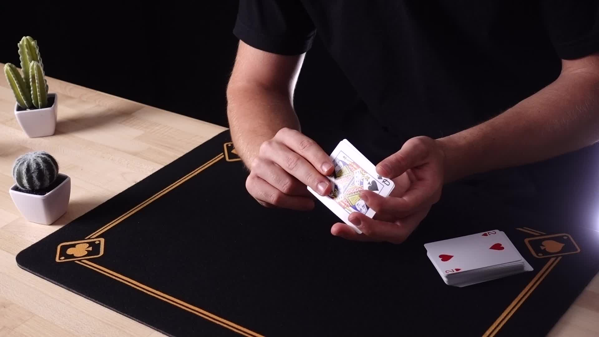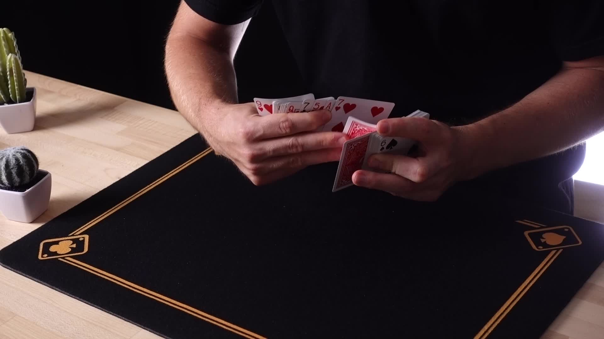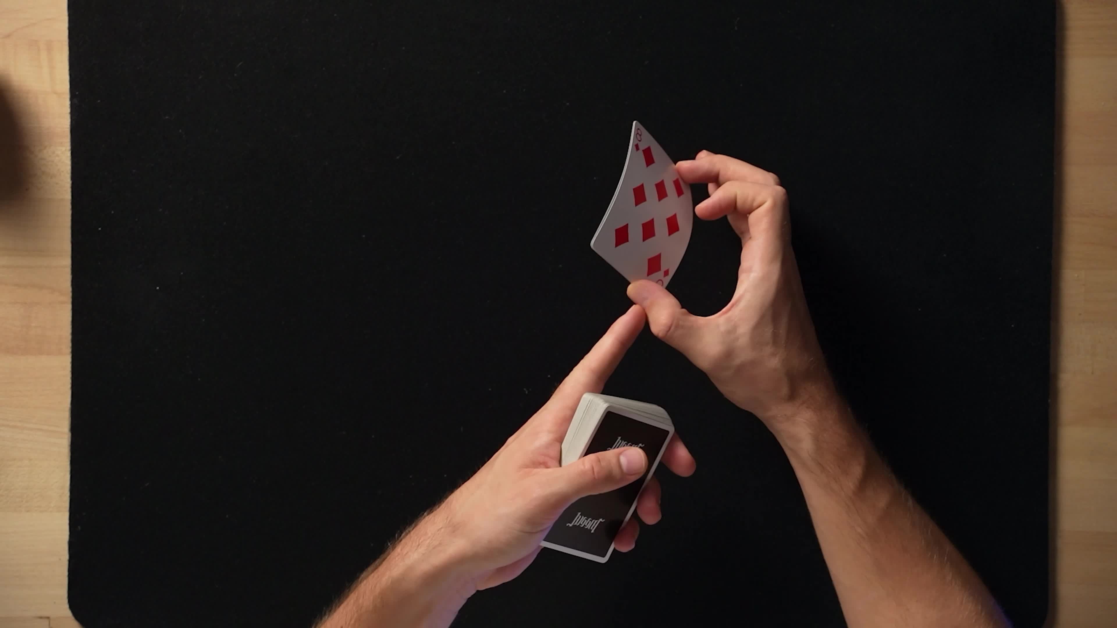フリオはすべての技法について「裏側から見たアングル(解説用アングル)」を説明しています。鏡で見ている自分の姿と比較できるよう、カードが裏側でどのような動きをしているのかを正確に確認できます。