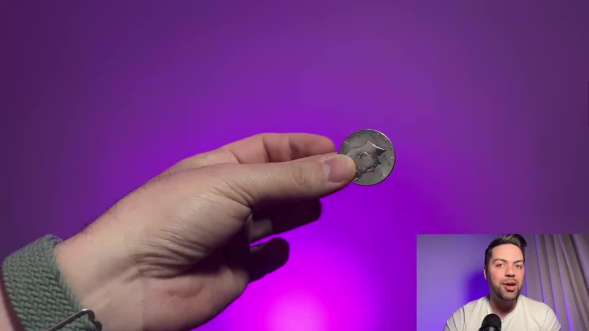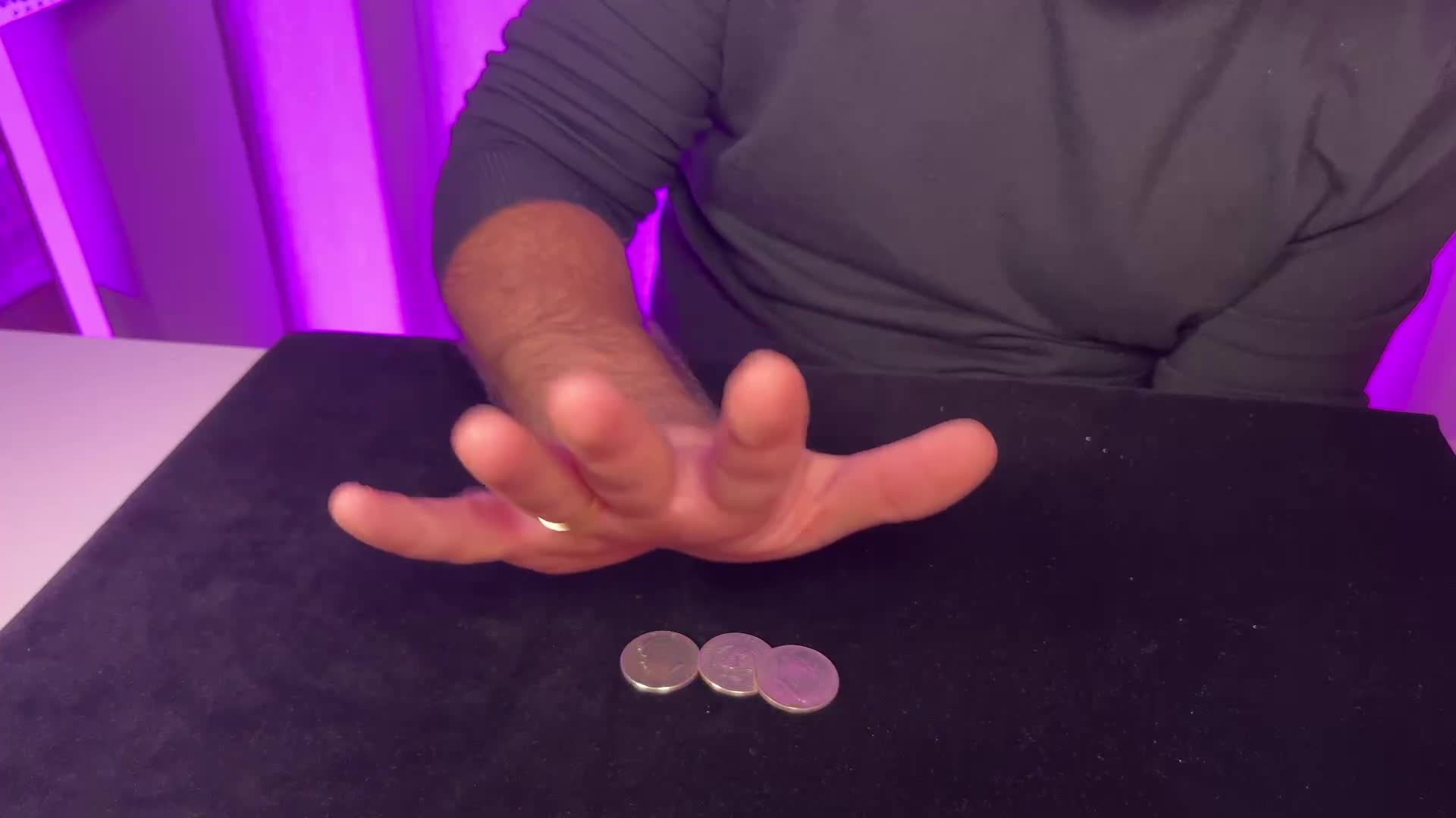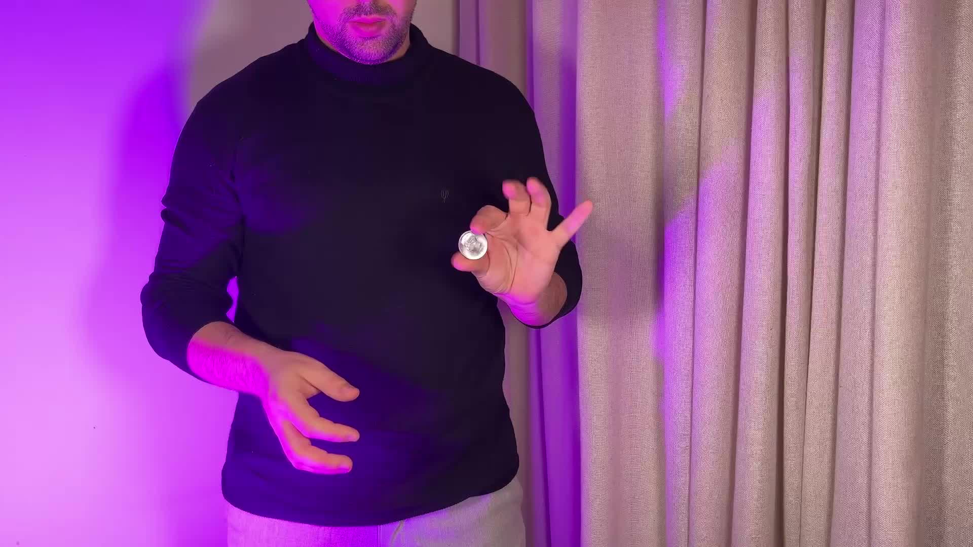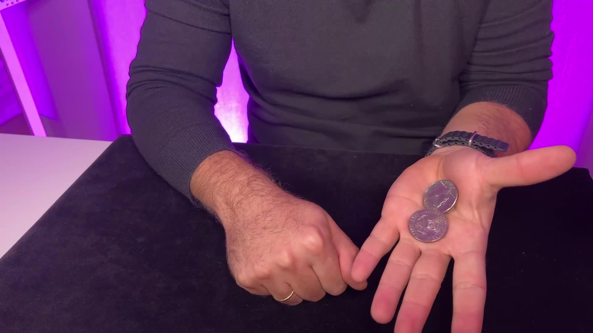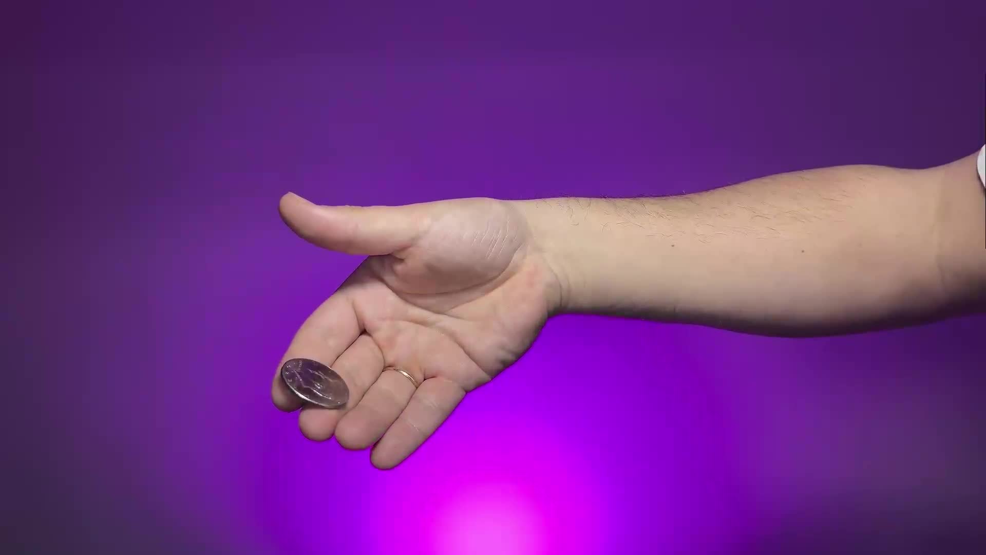 Pokazujesz półdolarówkę na samych opuszkach palców. Wyraźnie wkładasz ją do lewej dłoni i zamykasz palce. Gdy sekundę później otwierasz dłoń, monety już w niej nie ma. Wyciągasz rękę zza czyjegoś ucha i ponownie pokazujesz tę samą monetę. Wygląda to tak, jakbyś miał pełną kontrolę nad małymi przedmiotami, nie wkłądając w to pozornie żadnego wysiłku.